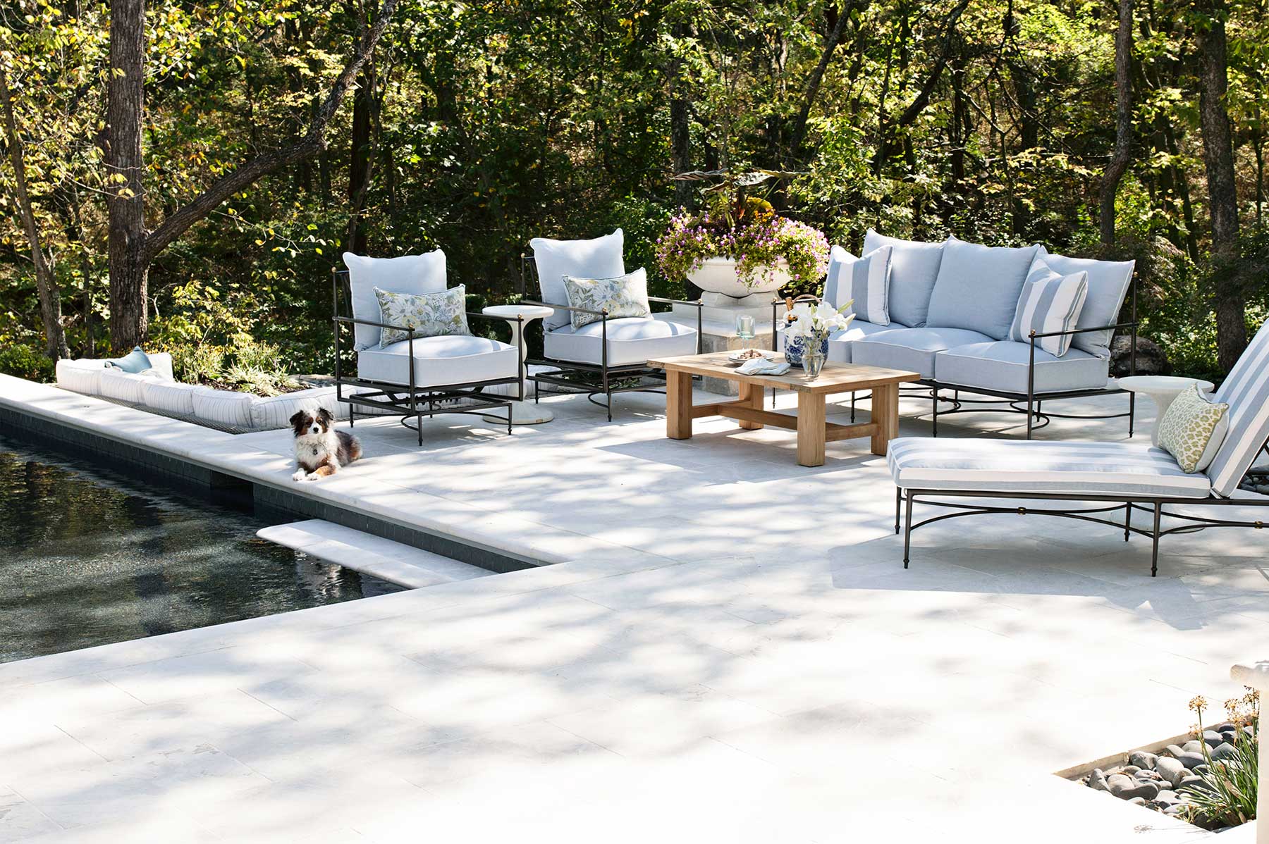 Muted creams, soft browns and grays unify the space, accented by wrought iron, teak and wicker furnishings. Fire bowls cast a warm glow, ensuring this outdoor haven is as enchanting by night as it is by day. With a retreat like this, the homeowners may never go back inside.
