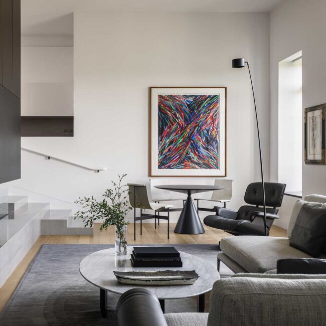 Design Detail Hawk Heights: Casework/ Fireplace/Stair Assembly At Hawk Heights, these coordinating elements serve as both a functional solution and a commanding design statement. This